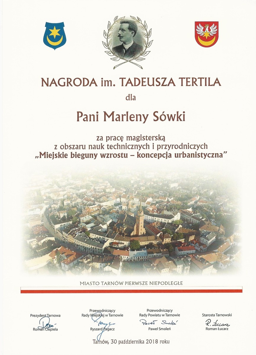 Marlena Sówka, absolwentka kierunku architektura na Wydziale Budownictwa, Inżynierii Środowiska i Architektury, otrzymała Nagrodę Tertila. Nagroda przyznawana jest za najlepszą pracę magisterską z obszaru nauk techniczno-przyrodniczych o tematyce związanej z Tarnowem lub powiatem tarnowskim.