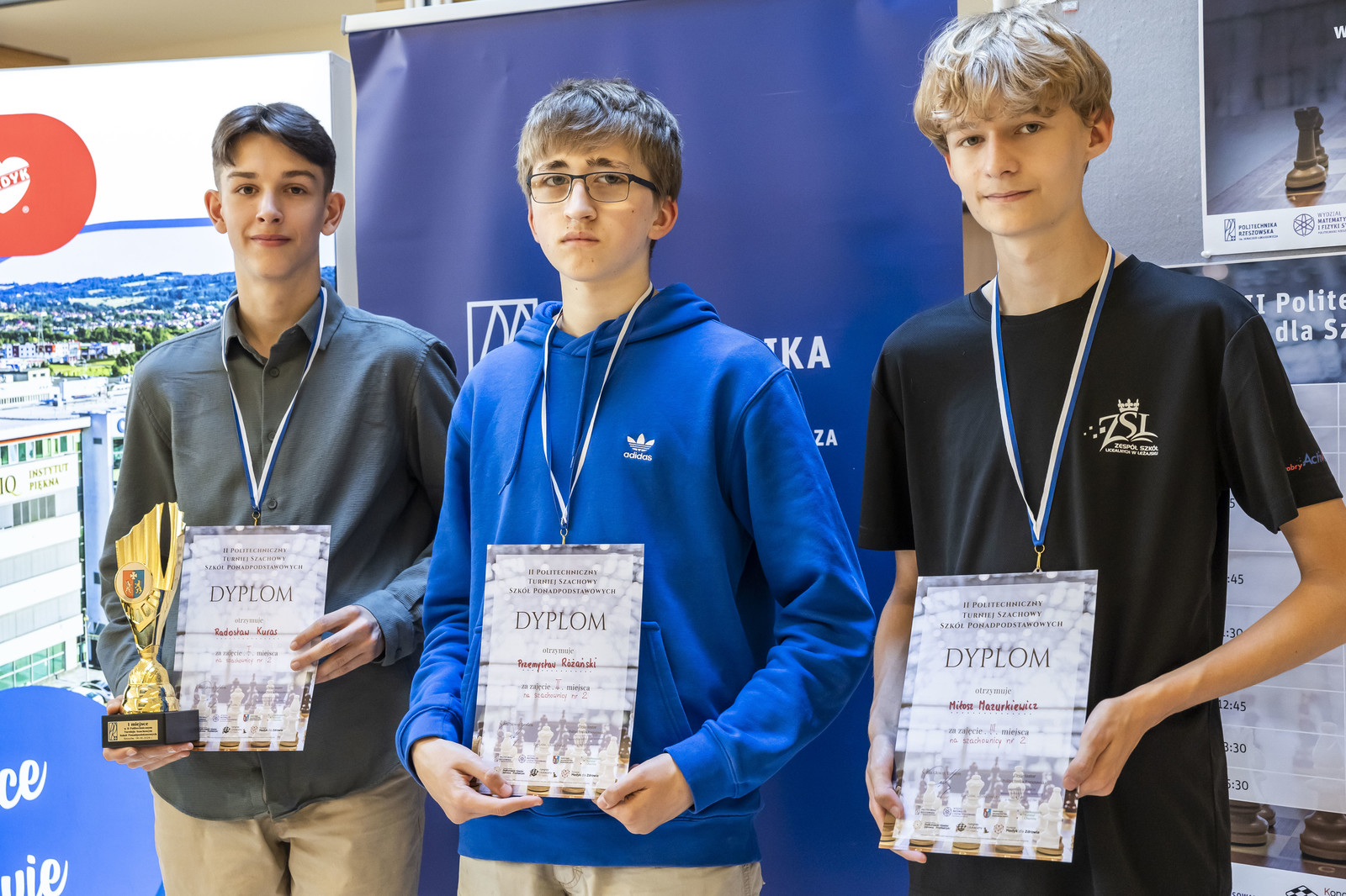 • szachownica nr 2: Radosław Kuras z II Liceum Ogólnokształcącego w Rzeszowie, Przemysław Różański z Liceum Ogólnokształcącego Sióstr Prezentek w Rzeszowie, Miłosz Mazurkiewicz z Zespołu Szkół Licealnych w Leżajsku,